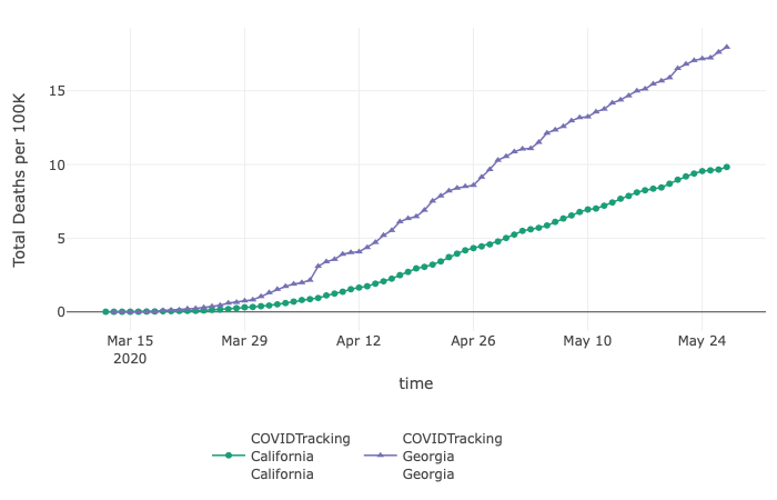 The CEID Coronavirus Tracker available in the COVID-19 Portal is an interactive visualization tool that displays up to date data about the number of cases, hospitalizations, and deaths due to COVID-19 in the United States and globally. UGA researchers and numerous external stakeholders use the tracker to understand how the SARS-CoV-2 virus continues to spread. For example, as shown below, through May 26 plotted data comparing the number of cumulative deaths per 100K in California and Georgia demonstrate that in each state, morbidity continues to rise. Although cumulative morbidity is no longer exponential, effective containment has not occurred. Georgia has experienced almost 20 deaths per 100K compared to California’s 10 although each state has tested approximately 4,000 residents per 100,000 people. We encourage you to explore the Coronavirus Tracker to learn more. If you have questions, please contact us.