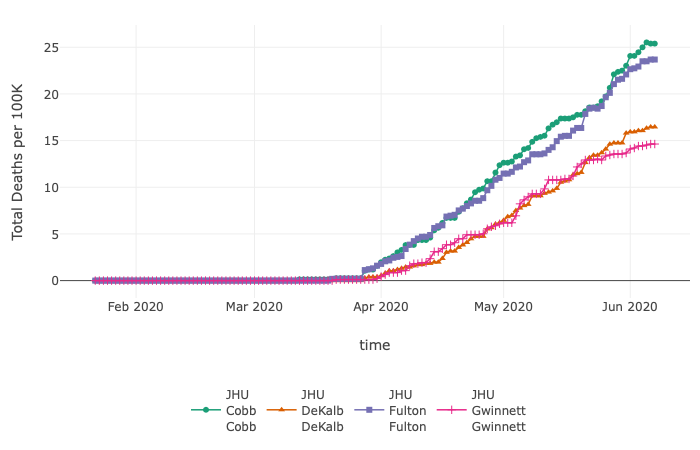 The CEID Coronavirus Working Group has been providing a visualization tool that shows COVID-19 cases, hospitalizations and deaths, as well as tests, for US states and countries. This tool has been updated and now also reports cases and deaths at the county level for each US state. The tool allows users to investigate the data in different ways. For instance, through June 7, by exploring cases per 100K, the data show that Dougherty County, GA (Albany, GA), with a population of ≈ 94,000, reported 169 total deaths per 100K. Bigger counties, such as Fulton (≈ 1 million residents), Gwinnett (≈ 920,000 residents), Cobb (≈ 755,000 residents), and Dekalb (≈ 753,000 residents), which are part of metropolitan Atlanta, report similar total deaths but lower numbers per 100K (Fulton – 23; Gwinnett – 14; Cobb – 25; Dekalb – 16).
