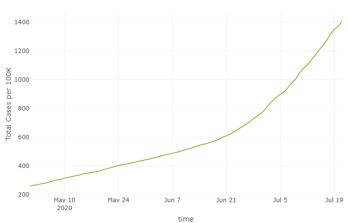 The Coronavirus Working Group continues to publish timely information about the COVID-19 pandemic in Georgia and the United States. Using the interactive visualization tools that are available on the COVID-19 Portal, data show that the number of confirmed cases, hospitalizations, and deaths continue to increase in Georgia and most other states. For example, as of June 3, there were 20 deaths/100K residents in Georgia. However, by July 21, the number of cumulative deaths increased to 30 deaths/100K residents, a 33% increase. On June 3, there were 460 cumulative confirmed cases/100K residents. In just seven weeks, by July 21, there were 1,403 confirmed cases/100K, a 67% increase.