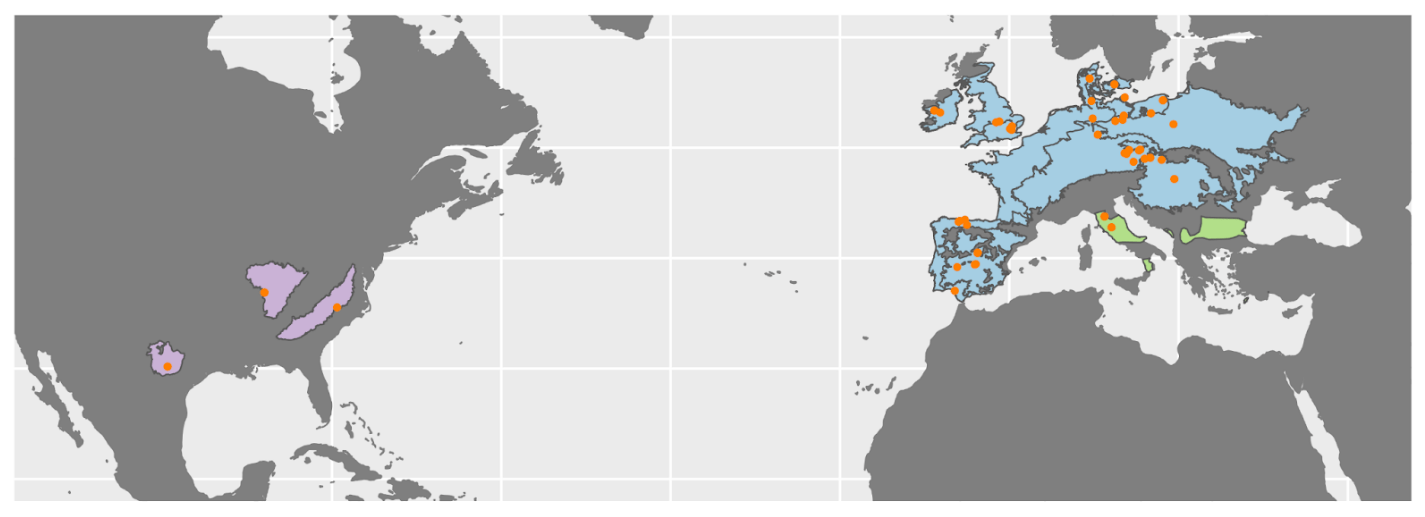 A range map developed for an example focal host, the fallow deer (Dama dama), whose non-native range consists of separate clusters in two zoogeographic realms. Native range shaded in green; non-native ranges shaded in blue and purple.